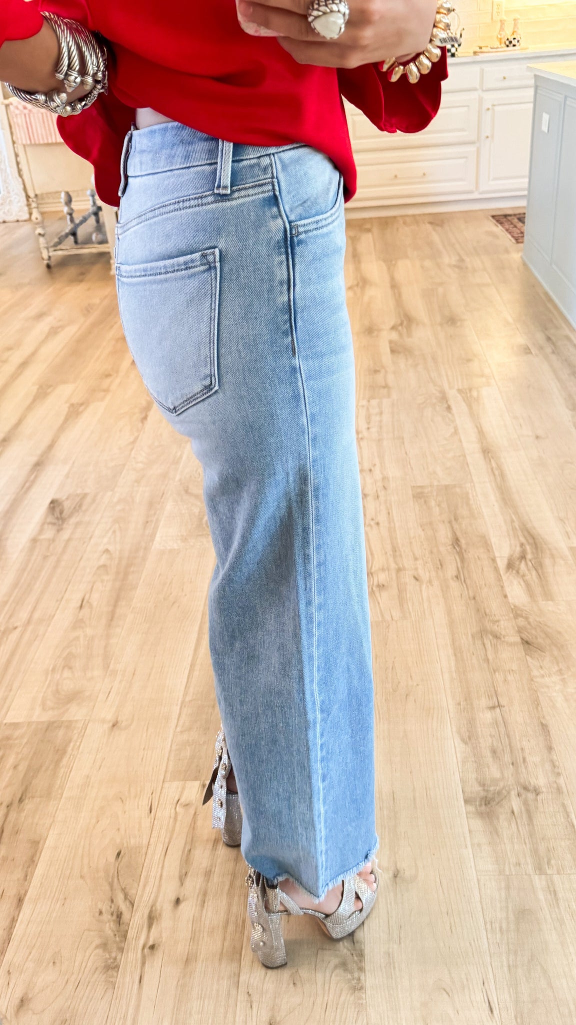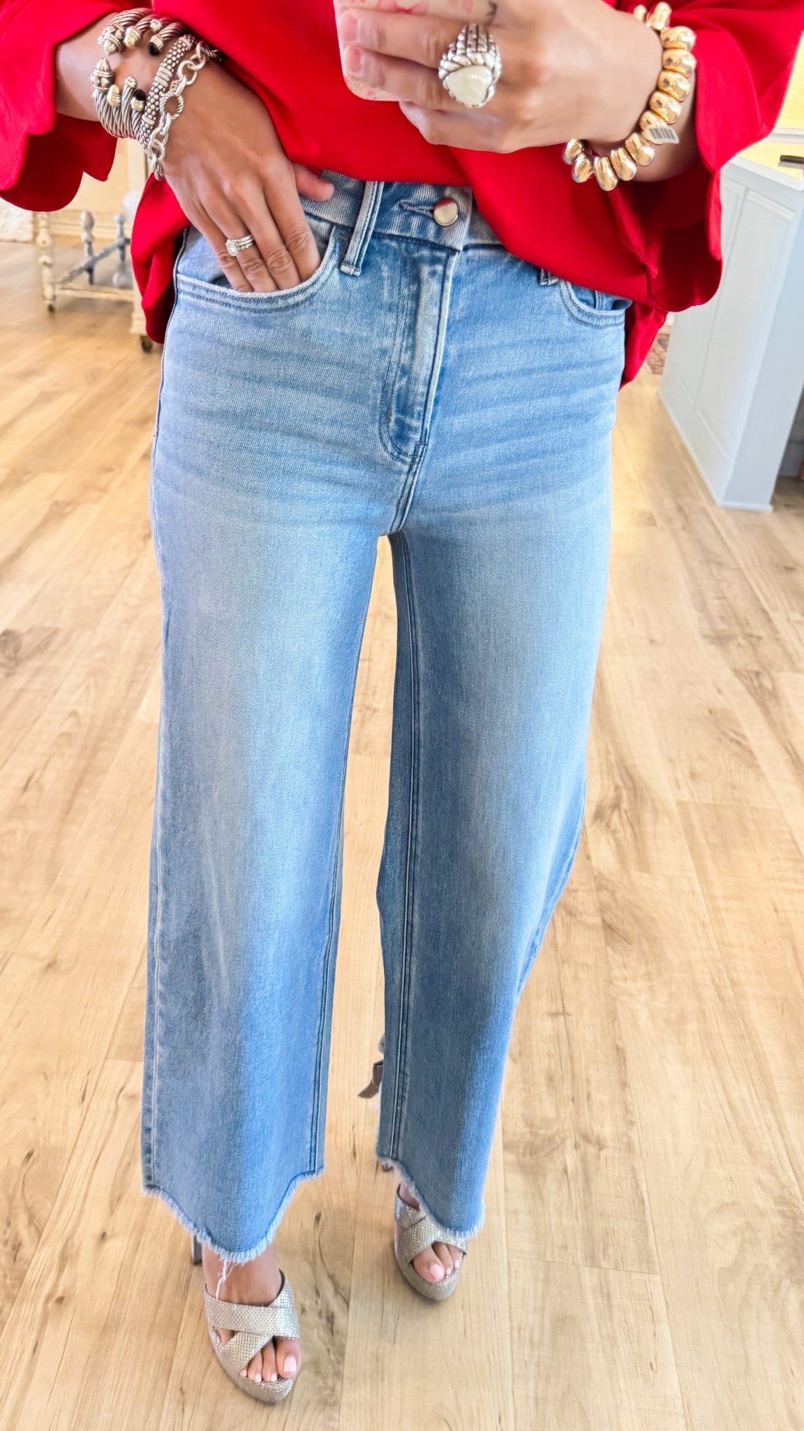 -high rise-wide leg -raw hem-seamless waistband -size 26 measurements, 27" inseam 10 1/2" rise