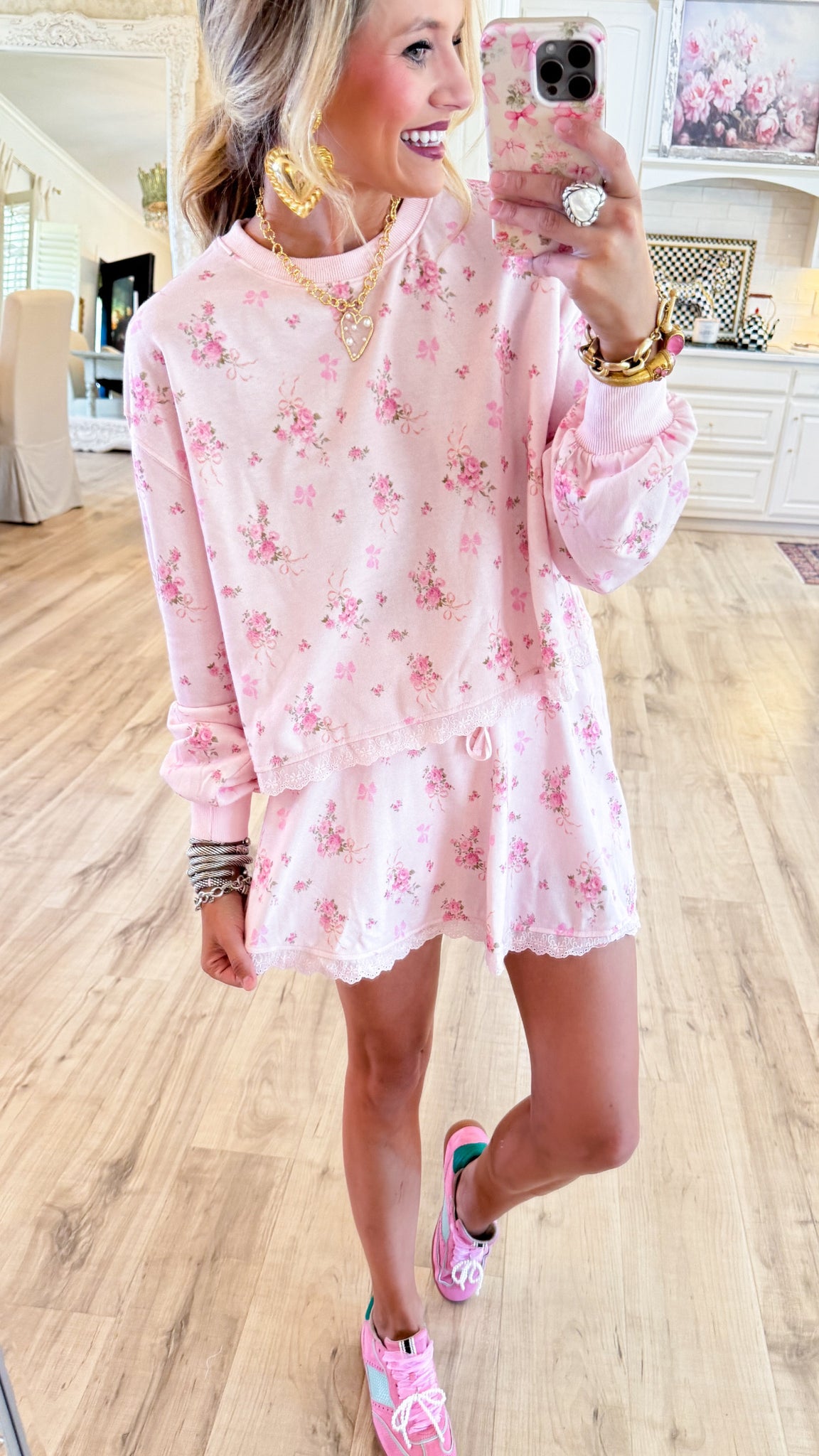 -long sleeve-rounded neckline-lace trim hem-elastic waistband-side pockets-inner shorts-small measurements, length