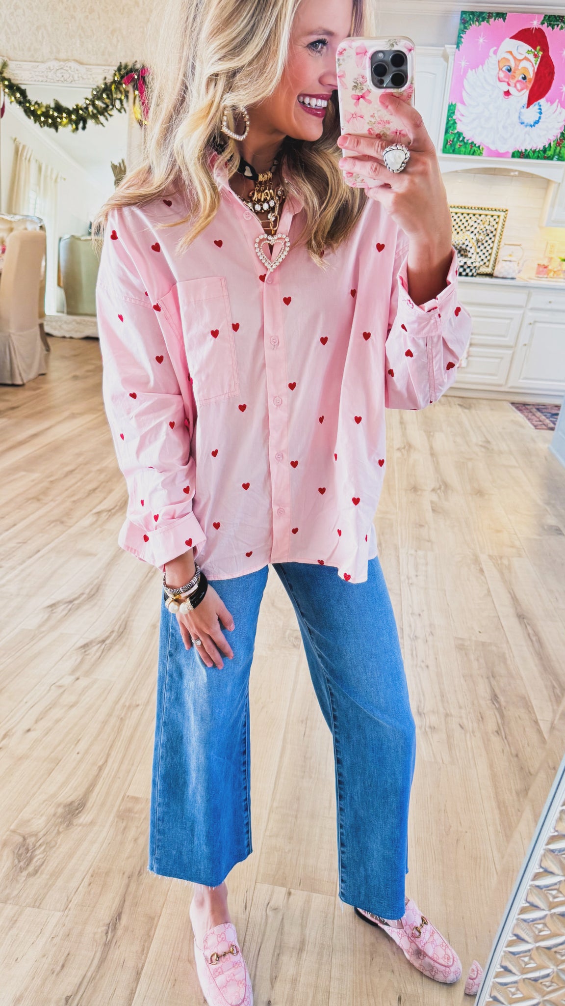Pink and Red Heart Embroidered Button Up