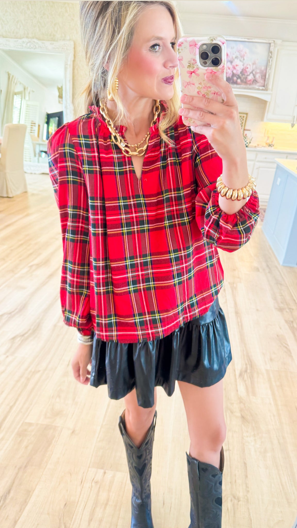 Love love this Christmas plaid top! Love the bubble sleeves with elastic and vneck detailing! Runs generous!