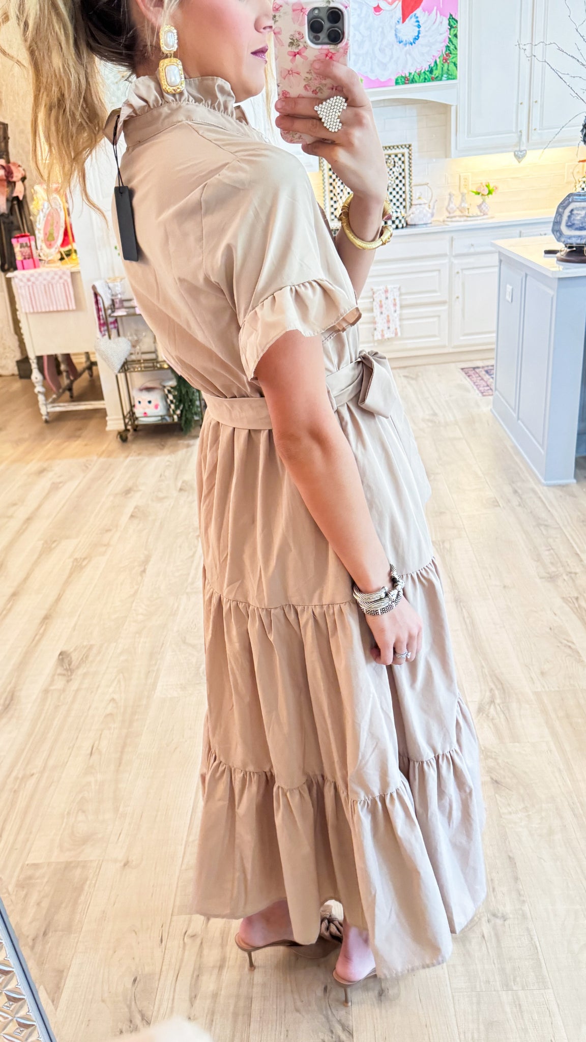 The cutest dress ever! Love love the Ruffle collar and the tie belt line! So cute! Side zipper detailing, runs true to size!