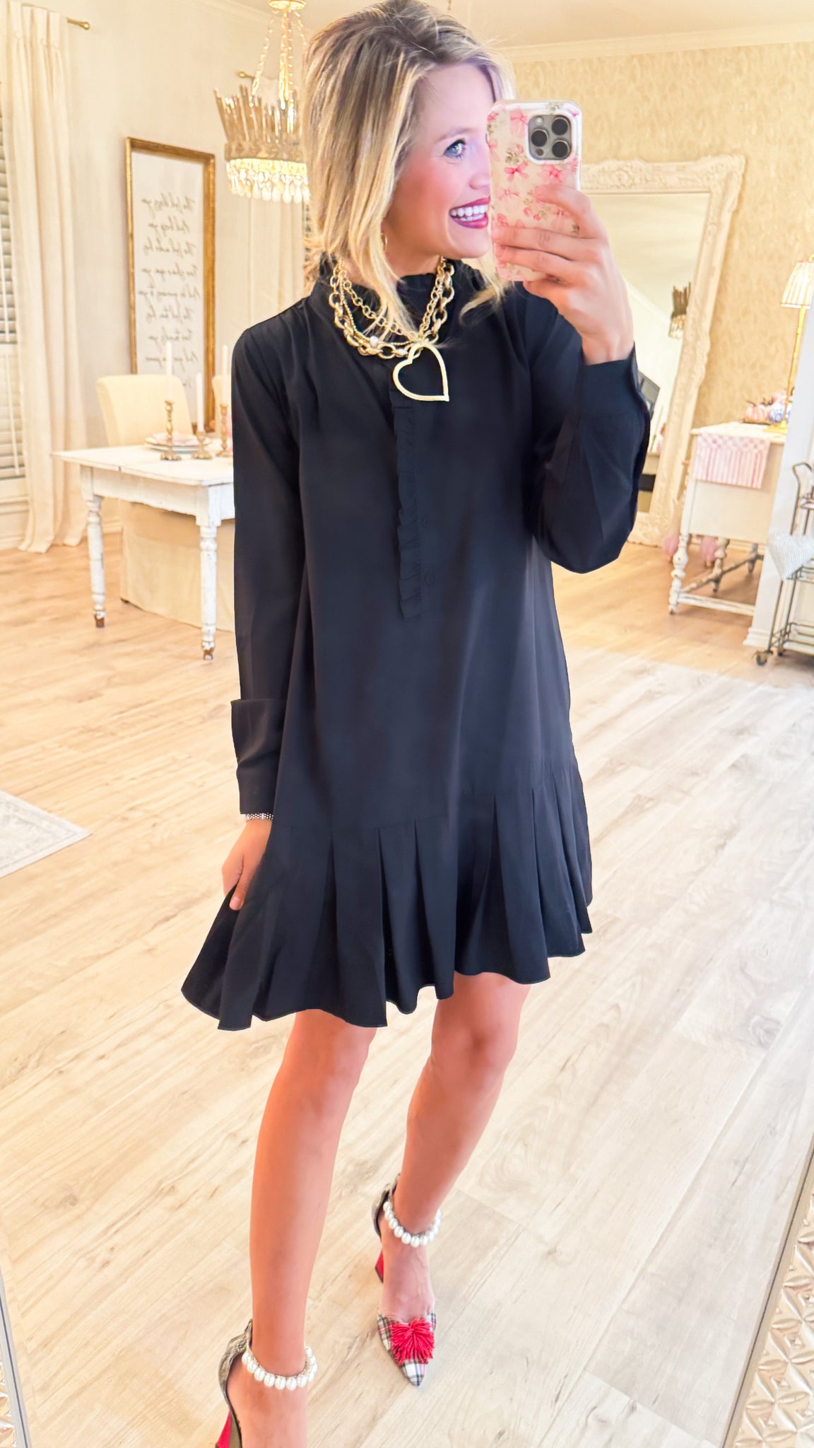-Ruffle collar-pleated skirt-front buttons-side pockets