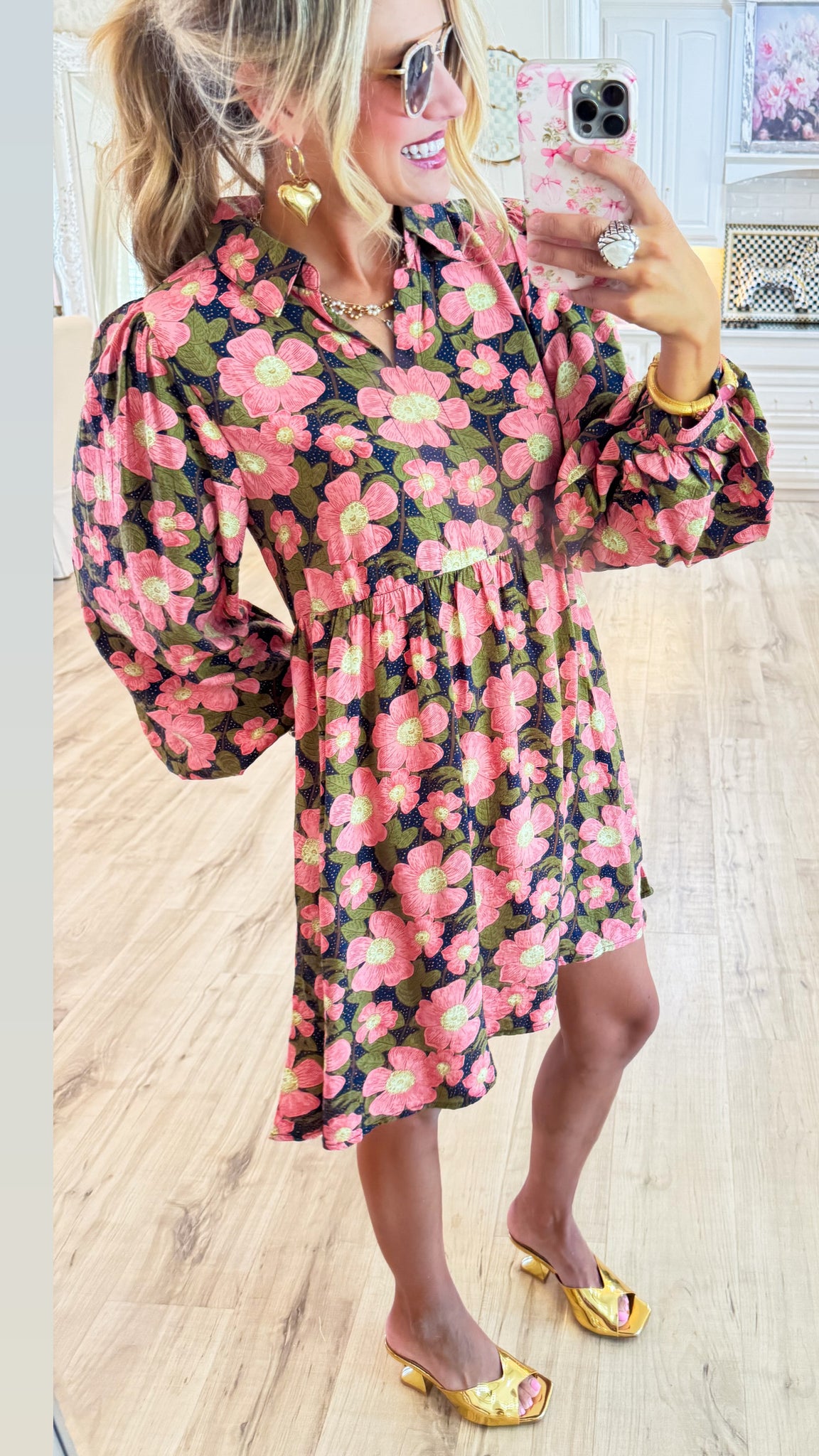 Pink and Navy Balloon Sleeves Floral Babydoll Dress
