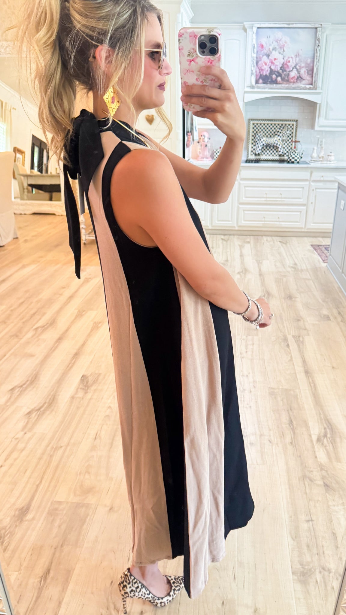 - Sleeveless- Rounded Neckline- Maxi Length- Colorblock Detailing