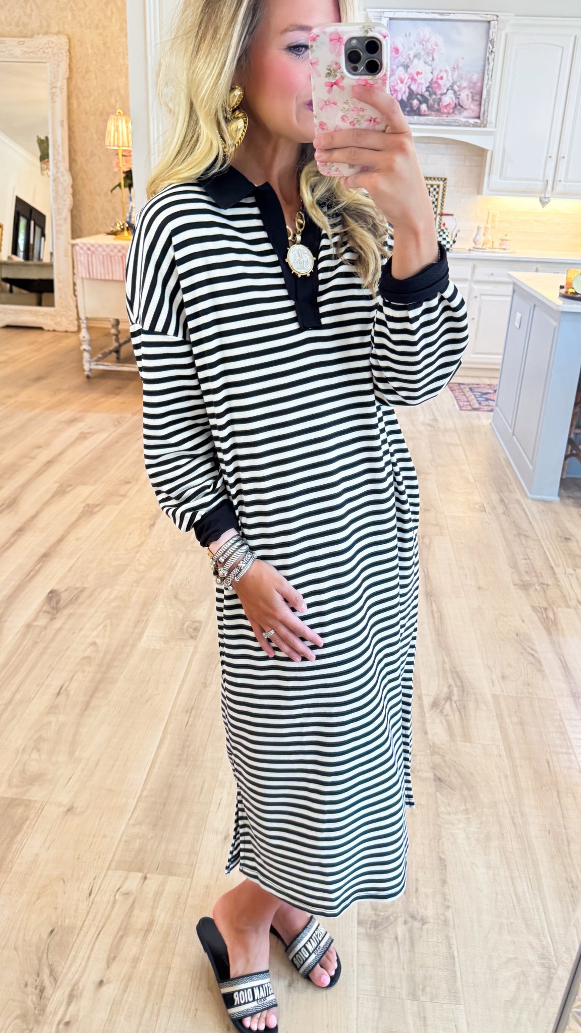 - Long Sleeve- Collard - Slit Neck - Striped Detailing - Small Measurements, Bust 56" Length 48"