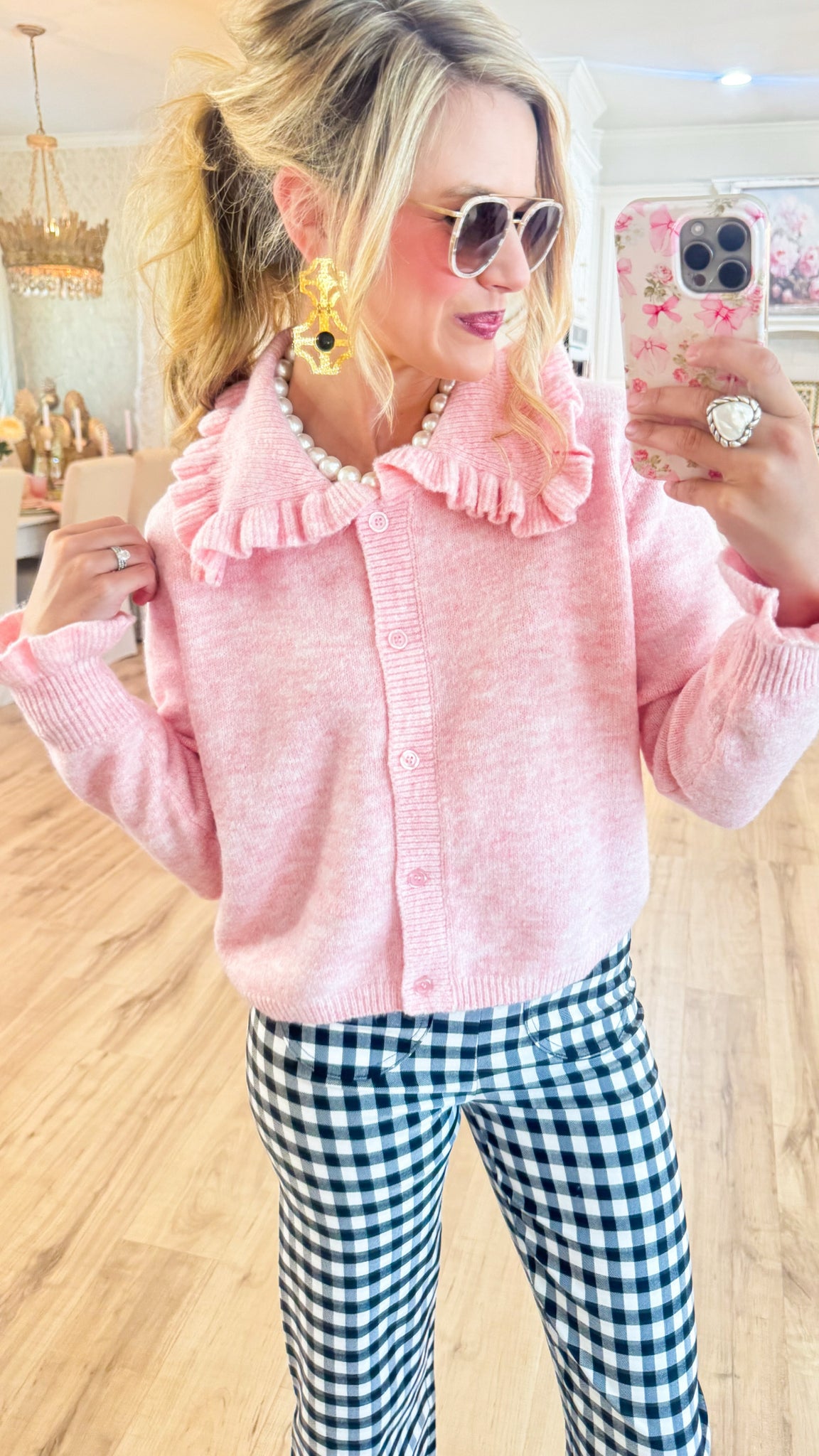 -long sleeves-front button up-ruffle detail cuffssmall measures 20" shoulder to hem, 46" bust