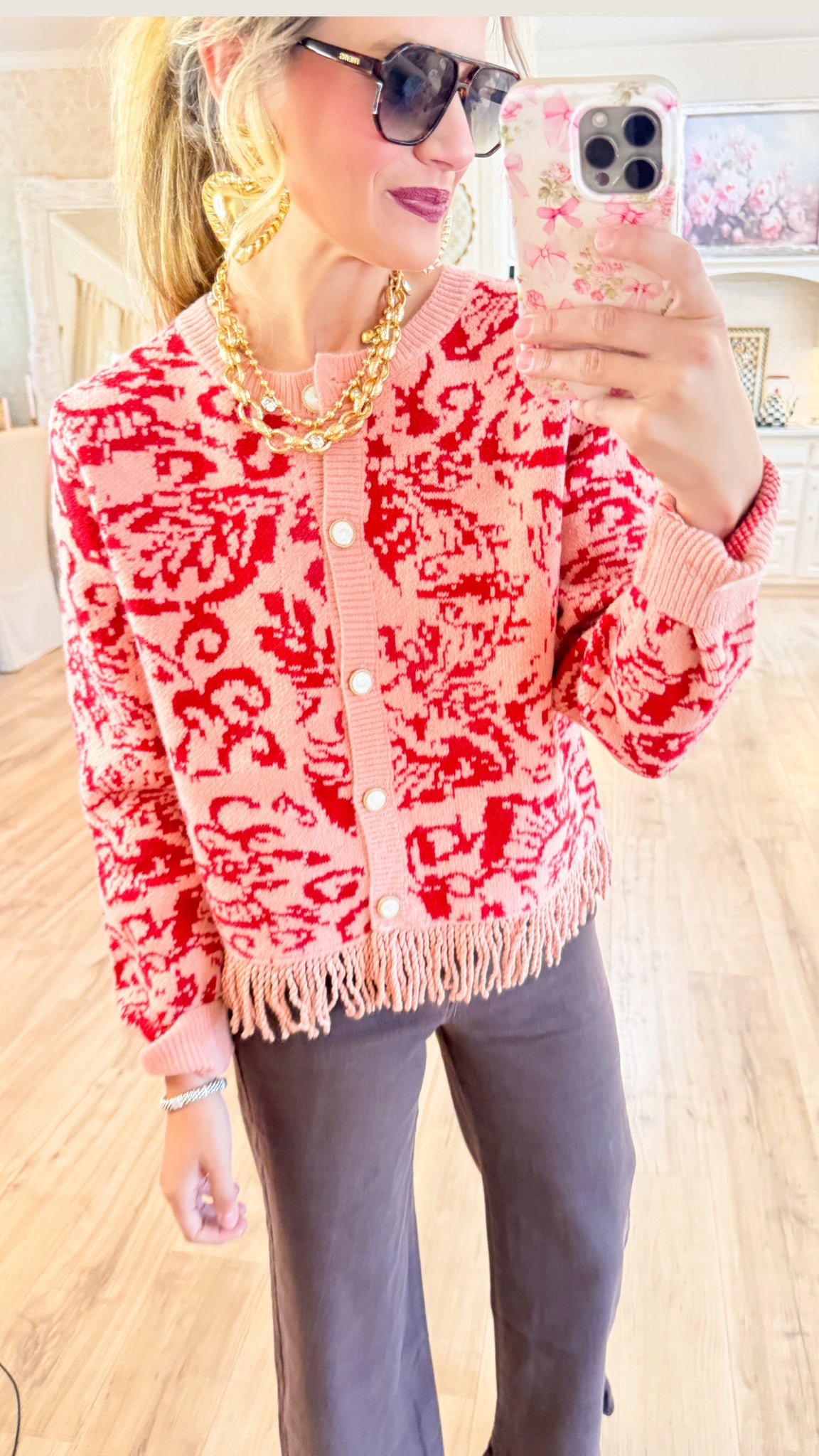 -long sleeve-rounded neckline-button up placket-ribbed cuffs-fringed hem-small measurements, length 20” bust 44”