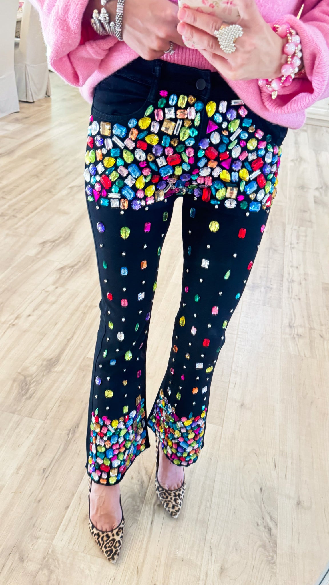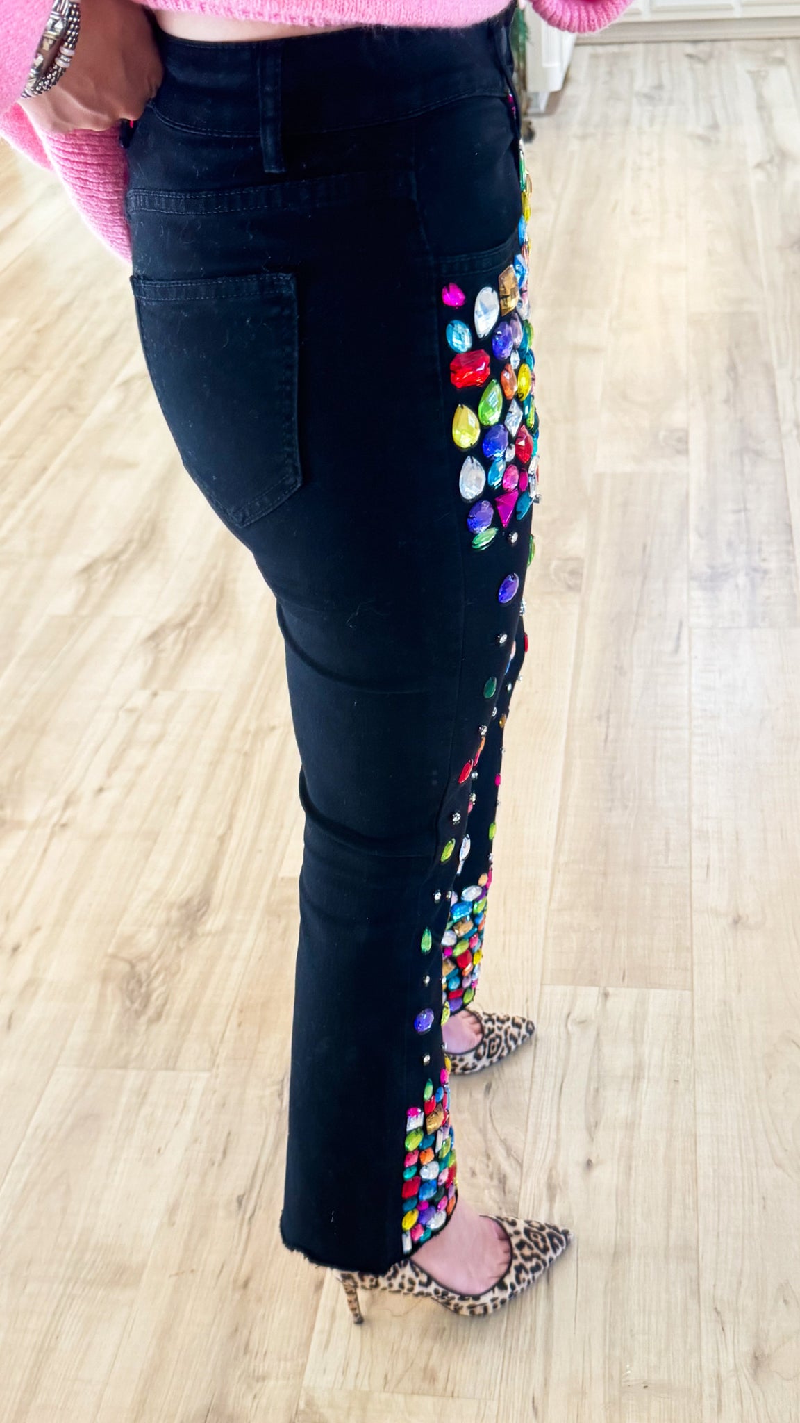 -flare legged-high waisted-rhinestone and beaded detain in front-raw hem
