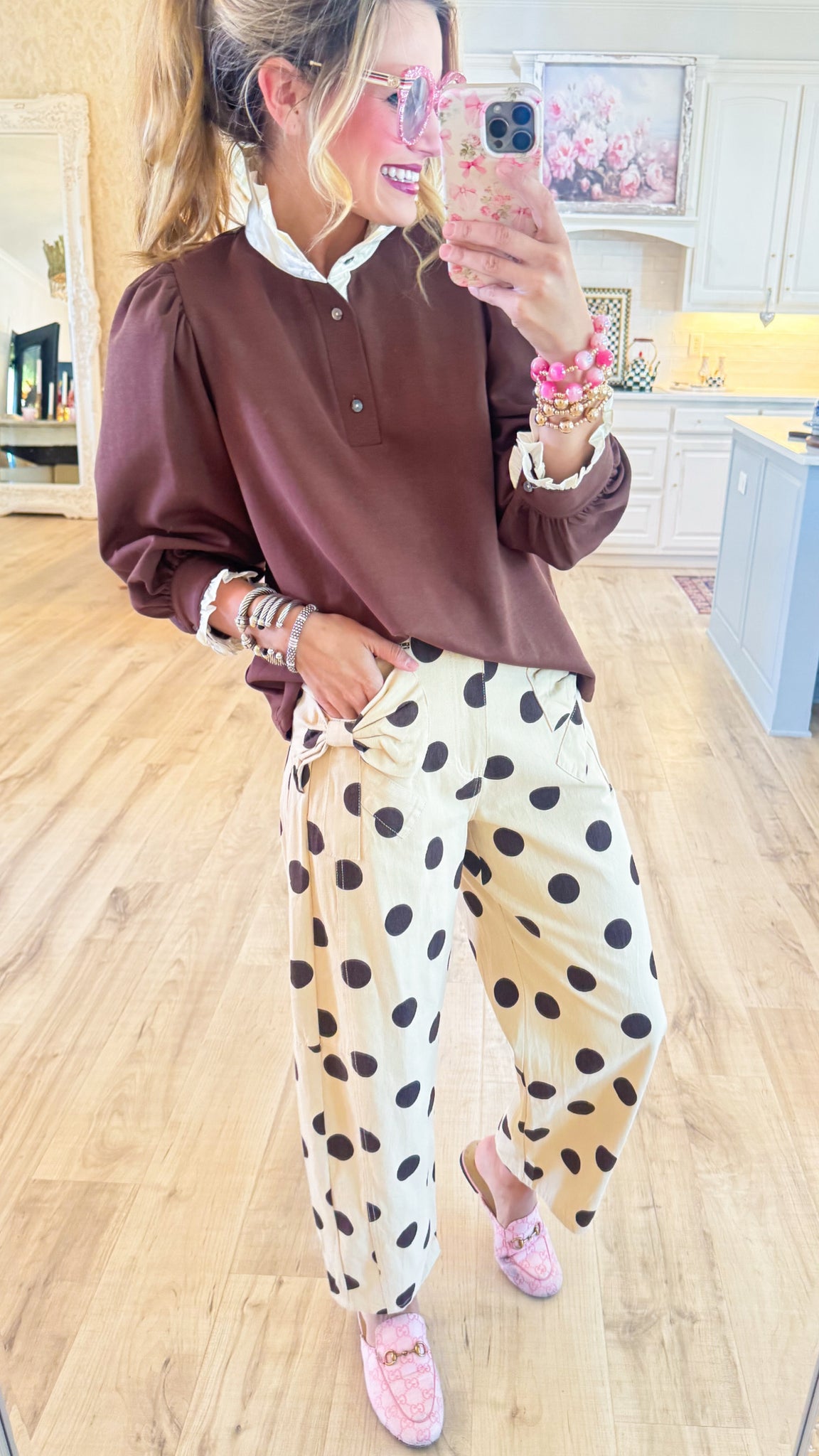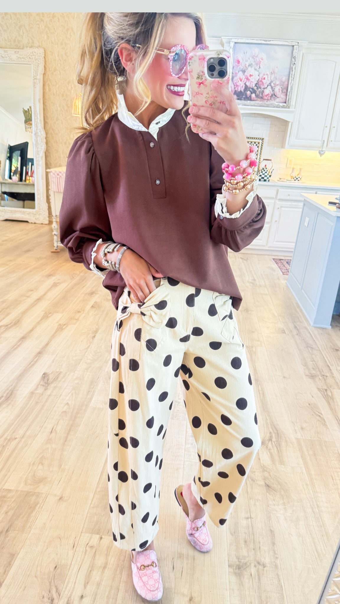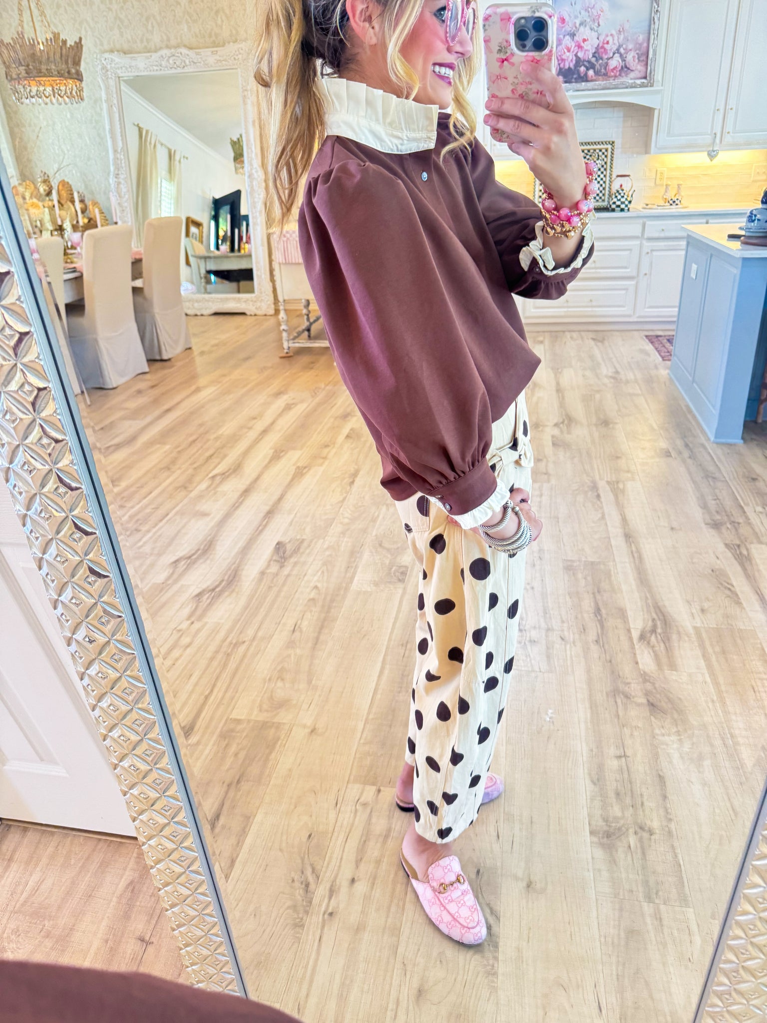 Brown Puff Sleeve Contrast Collar Top