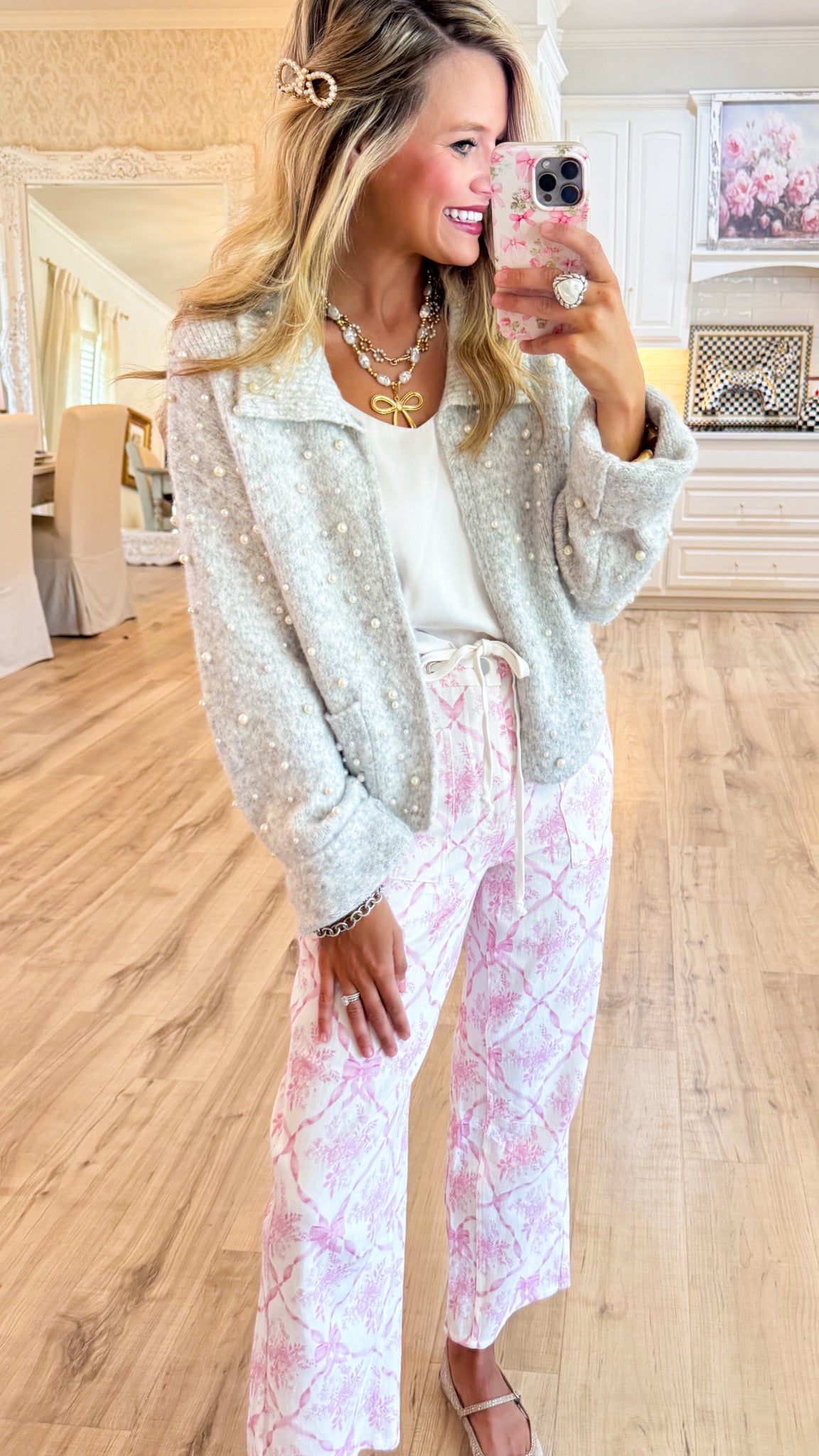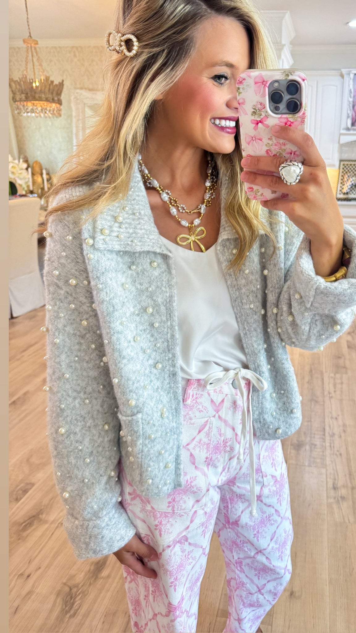 Light Grey Pearl Embellished Sweater Cardigan