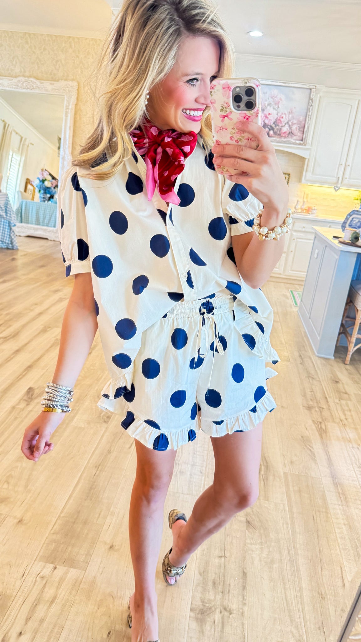 -short sleeves-front button-collared-drawstring waist-side pockets-ruffle hem