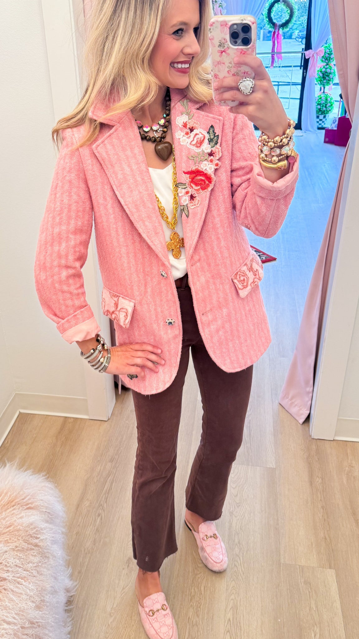 Pink Stripe Herringbone Embroidered Patch Jacket