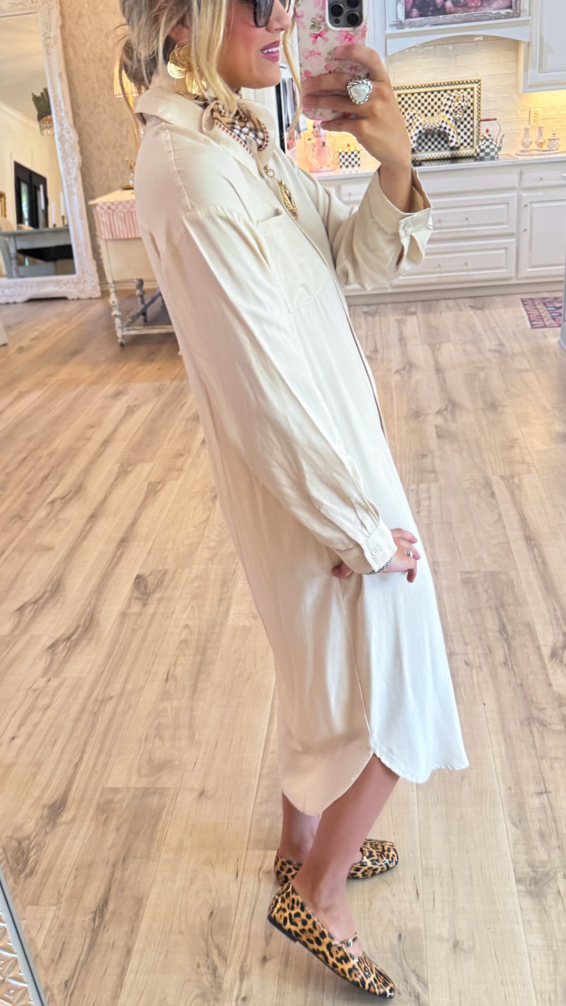 -long sleeves-collared-front button detail-side pockets-curved hemsmall measures 42” bust, 44 1/2” shoulder to hem