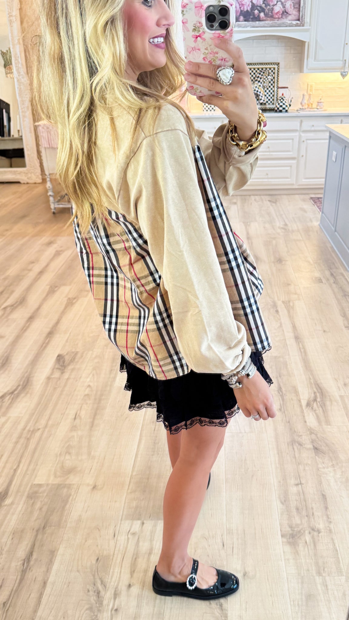 - Long Sleeve- Rounded Neckline- Solid and Plaid Detailing- Small Measurements, Bust 44"