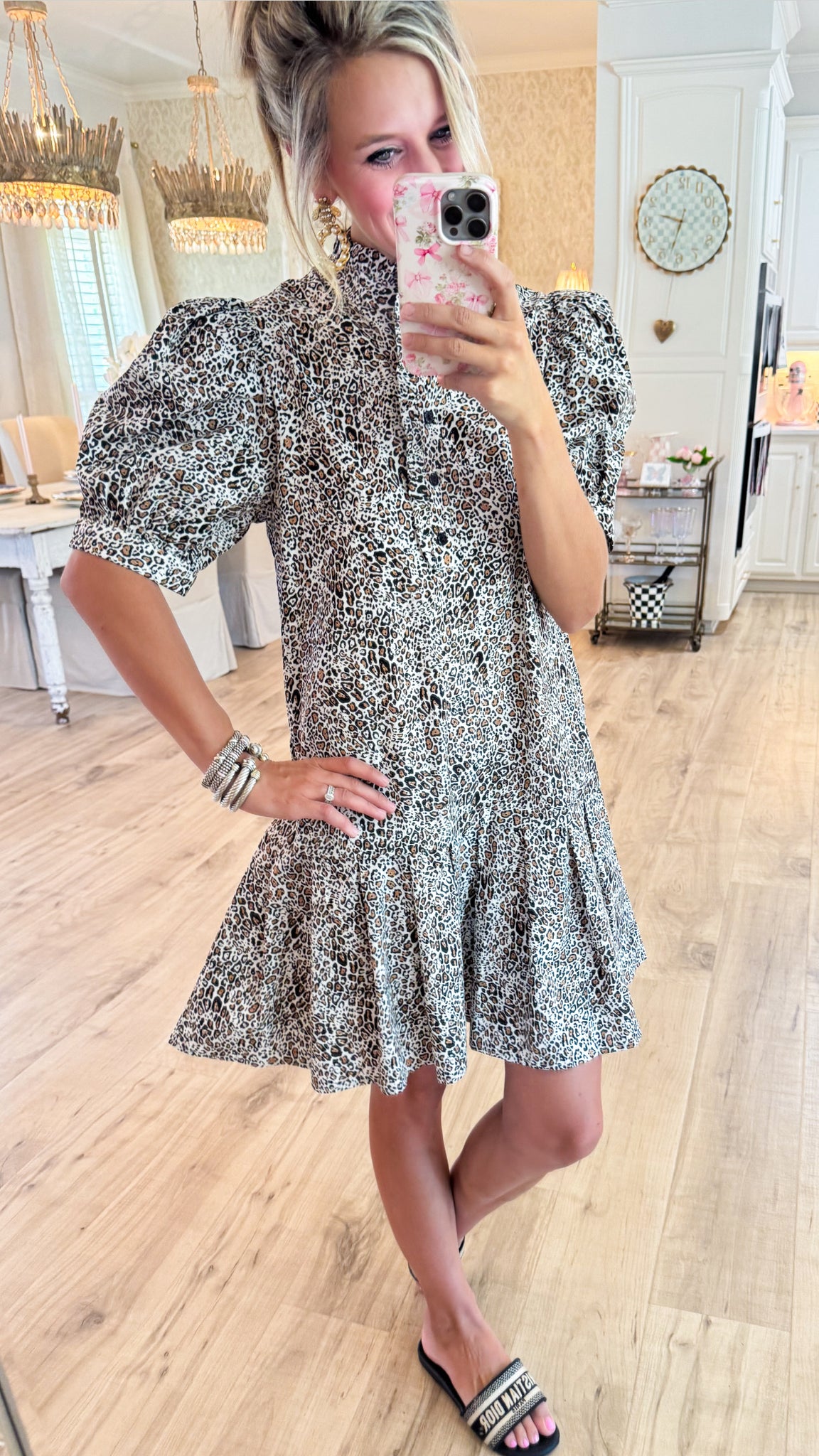-short puff sleeves-front button detail-frilled neck-side pockets-pleated skirt