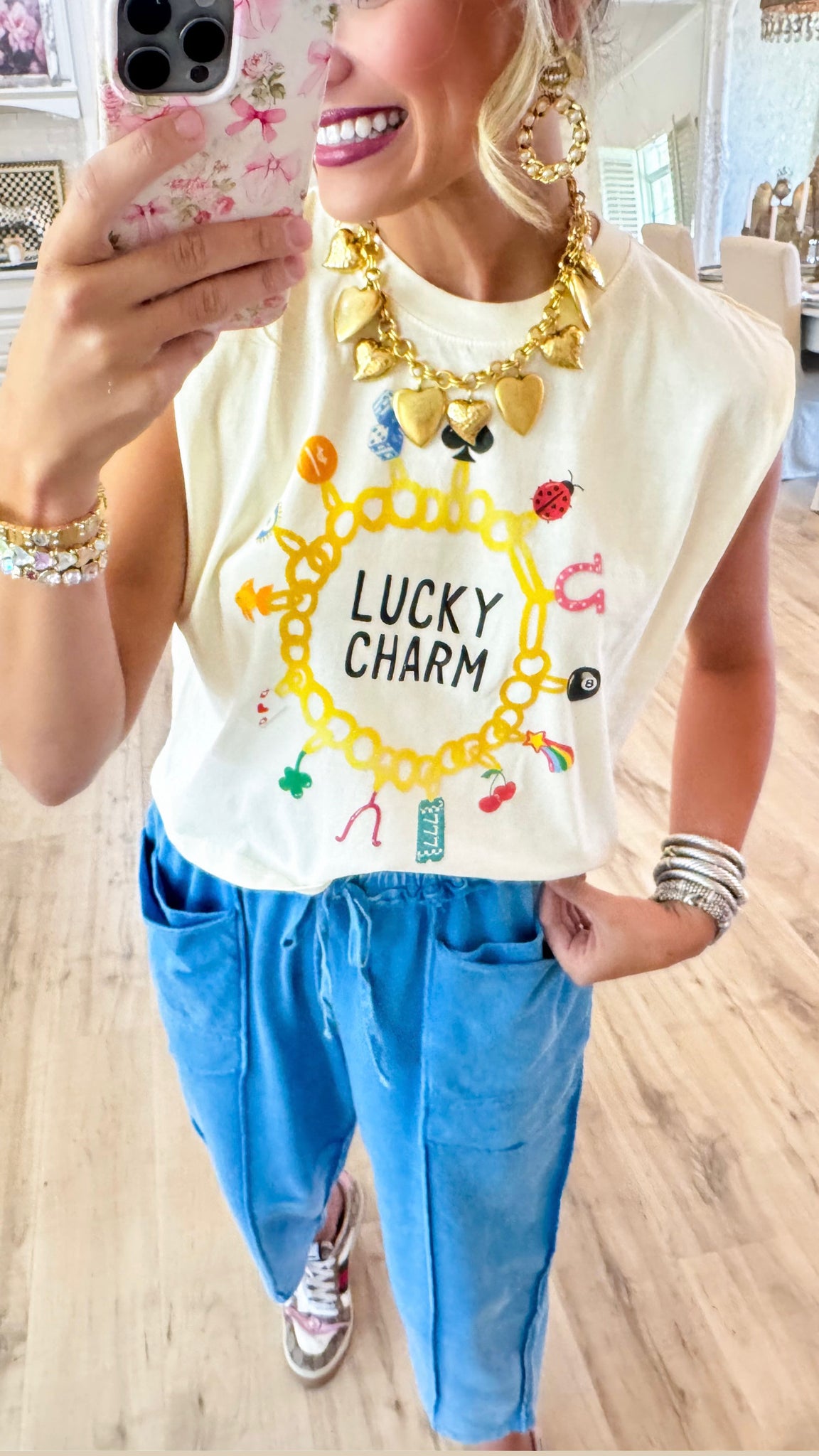 The cutest muscle tee! Love the lucky charm!!!!! Runs true to size!